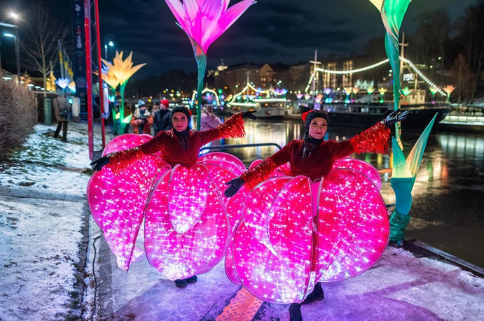 The promenading performance Aurora charms your audience! In this new promenading light show you can witness majestic never before seen light wings. Light show Aurora awakens northern solar winds. In the performance the wings reflect the colors of aurora borealis and lights up to flicker when the dark comes.